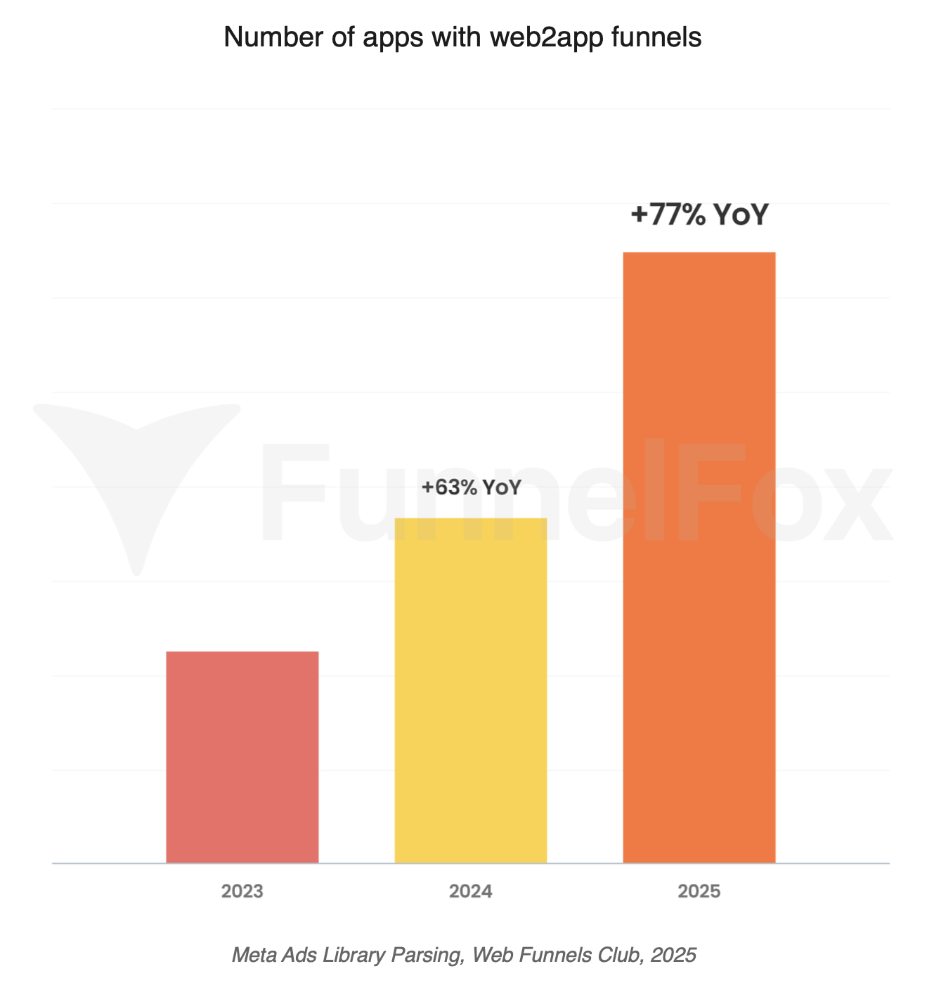 The number of apps running web2app funnels grew 77% year-over-year as of 2024, with health and fitness still leading by volume but the pattern spreading steadily into finance, relationships, and personal development.